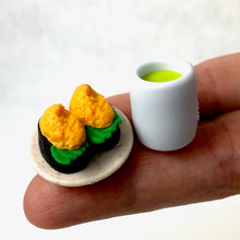 $1.25 each set of sushi erasers on plate with green tea.